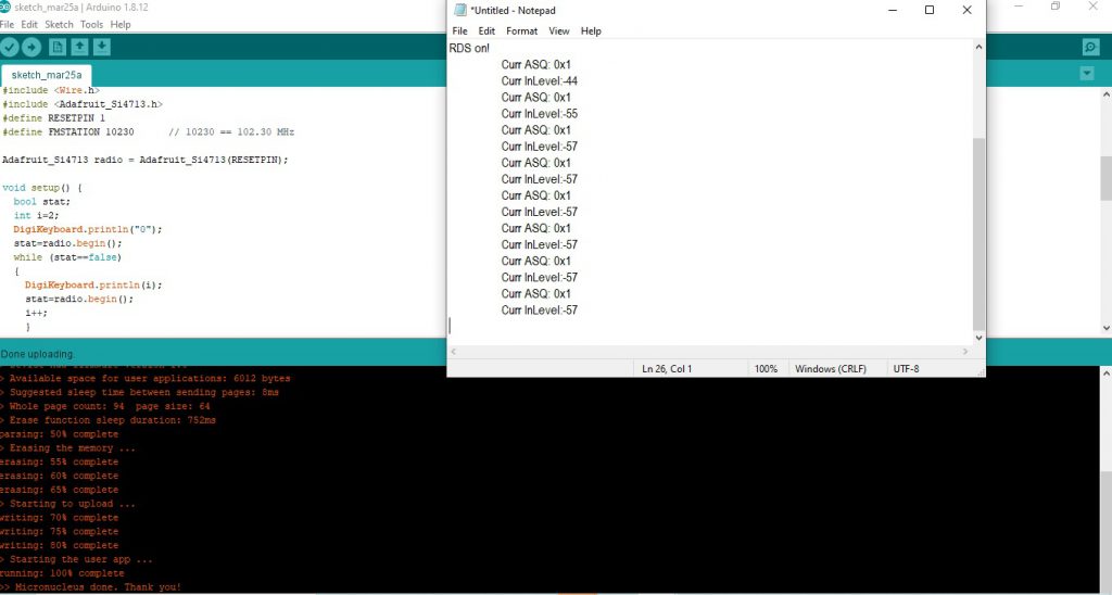 بعد از بارگذاری کد دمو، تا زمانی که در Notepad پیام RDS on چاپ میشود به معنی درست کار کردن برد میباشد. همچنین بعد از اتصال جک 3.5 میلیمتری به ورودی صدای ماژول ارسال FM، مطمئن شوید که میزان ولوم دریافتی همیشه بین 0 تا 10- دسیبل باشد.