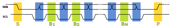 در حالت عادی هر دو خط (SCL و SDA) در حالت یک منطقی هستند. ارسال داده توسط دستگاه Master آغاز می شود. وضعیت شروع (S) و به دنبال آن آدرس دستگاه Slave (در بخش B1 در شکل بالا) توسط Master تولید و ارسال میگردد. در صورتی که بیت 0 از بایت آدرس در حالت 0 تنظیم شود، Master در Slave مینویسد (B2). در غیر این صورت، بایت بعدی از Slave خوانده میشود. پس از خواندن یا نوشتن تمام بایت ها، Master وضعیت توقف (P) را تولید و ارسال میکند. در نتیجه پیام پایان یافتن ارتباط به تمام دستگاههای متصل به باس ارسال گردیده و باس برای شروع ارتباطی دیگر آماده میگردد.