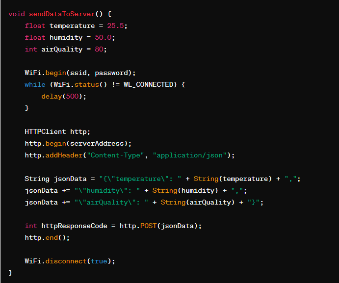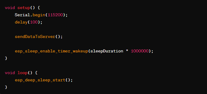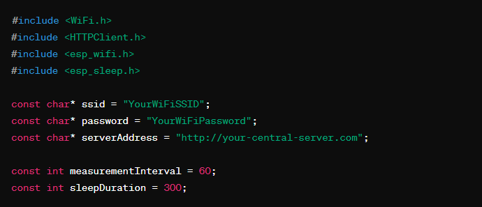 در این مثال دستگاه فرضیای را در نظر بگیرید که در آن از میکروکنترلر ESP32 استفاده شده. هدف ساخت این دستگاه اندازهگیری دما، رطوبت و کیفیت هوا به کمک سنسورها و ارسال این دادهها به سرور مرکزی میباشد. قطعه کدهای زیر نحوه متصل شدن به WiFi، دریافت اطلاعات اولیه از سنسور، ارسال دادهها به سرور فرضی و وارد شدن به حالت Deep Sleep را نشان میدهند.