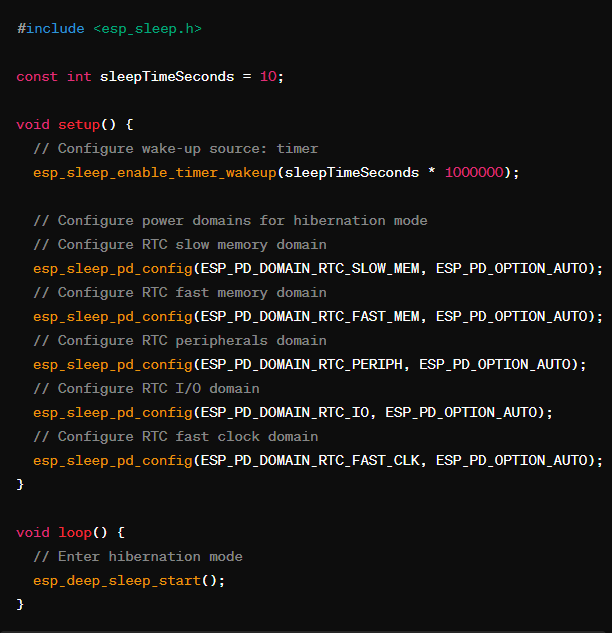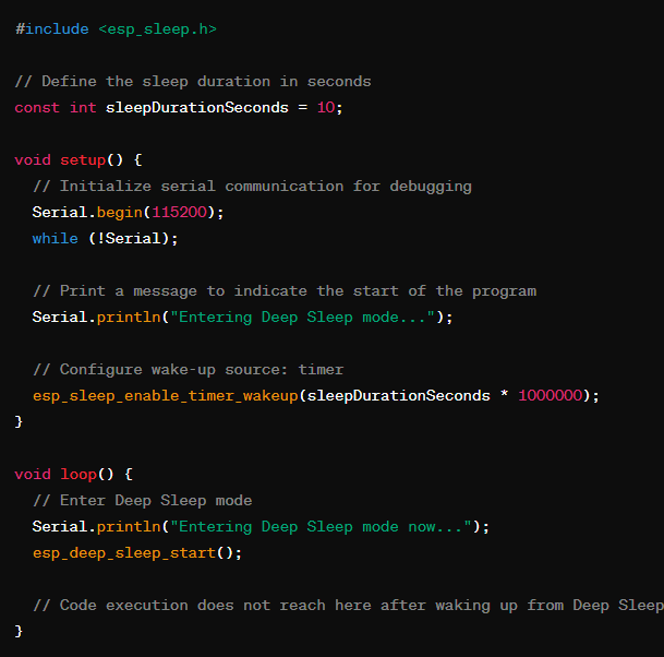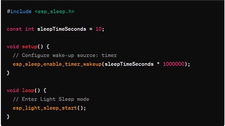 به کار رفته است. کد از ابتدا اجرا میشود تا به تابع `()esp_light_sleep_start` برسد؛ سپس به خواب میرود و پس از 10 ثانیه بیدار میشود. بعد از بیدار شدن، کد دوباره از ابتدا اجرا میشود؛ بنابراین بعد از تابع `()esp_light_sleep_start`نباید کد دیگری نوشت زیرا انجام نخواهد شد.