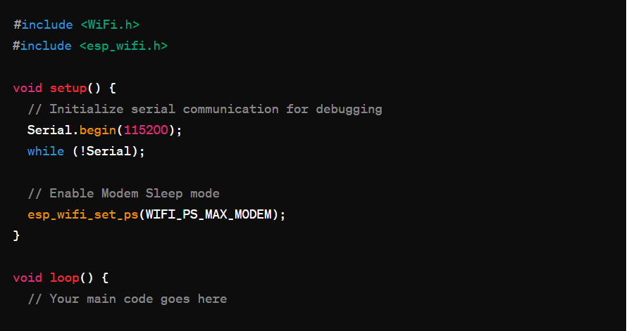 همچنین برای غیر فعال کردن این الگوی خواب میتوان از تابع `()esp_wifi_set_ps` استفاده کرد و مقدار آن را `WIFI_PS_NONE` قرار داد.